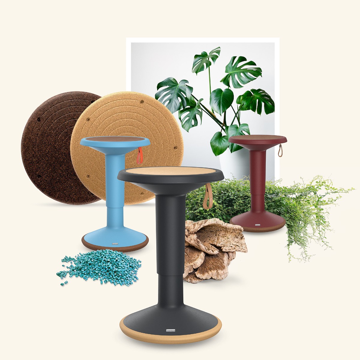 De in hoogte verstelbare kruk is verkrijgbaar in uiteenlopende kleuren. Waardoor onderscheidt hij zich? Zijn materiaal. De UP is gemaakt van zuivere en recyclebare kunststof en zo geconstrueerd dat hij langdurig meegaat. De ECO UP is de duurzaamste variant. Zijn romp is vervaardigd van biobased kunststof vermengd met houtvlokken en de zitting bestaat uit biobased kunststof met kurk. Voor beide geldt dat ze beweging in het dagelijks leven brengen: flexibel en multifunctioneel.